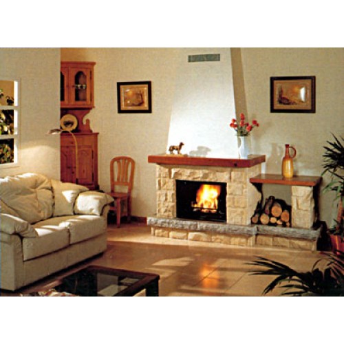 Фронтальный камин из песчанника Arenisca грубой обработки без шва. Плита из полированного камня San Vicente с неровным кантом. Деревянная балка. Металлическая топка 904 с колосником и зольником.