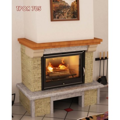Компактная пристенная каминная облицовка Мета ТРОЯ 705 изготовлена из колотого доломита желтого цвета, натурального мрамора (бежево-серого цвета) с обработкой Антик и камня META Stone™ серо-белого цвета.