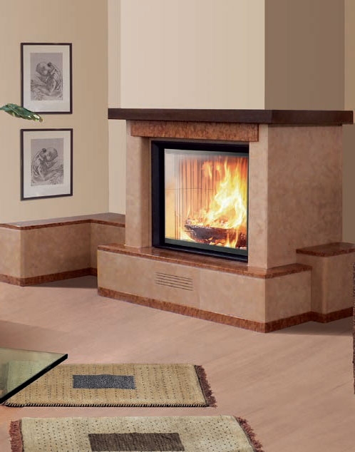Пристенная облицовка с банкеткой слева. Боковые детали и цоколь из розового мрамора perlino. Плита и отделка из полированного красного asiago. Балка из темного дерева.