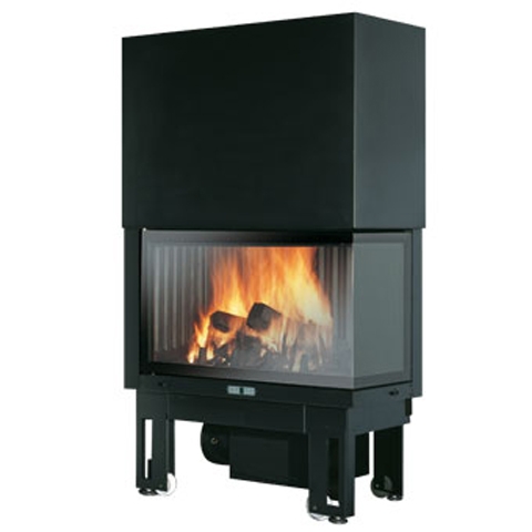 Закрытая топка с металлическим корпусом темно-серого цвета. Дверца с боковым стеклом, окрашенная в черный цвет, единое витрокерамическое фронтально-боковое стекло с подъемным механизмом.