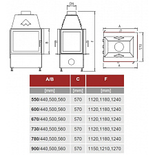 Стальная каминная топка с прямым стеклом. Подъёмная дверца (Система Easy-Lift). Горизонтальное открывание двери для чистки стекла. Ширина дверки 536 мм. Высота дверки 488 мм. Возможно подключение воздуха извне.